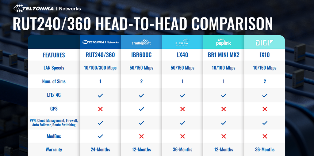 Le RUT360 est une version mise à jour de notre best-seller de tous les temps, le RUT240. Ce routeur cellulaire industriel compact offre la possibilité de se connecter à Internet via des réseaux cellulaires, Wi-Fi et filaires.