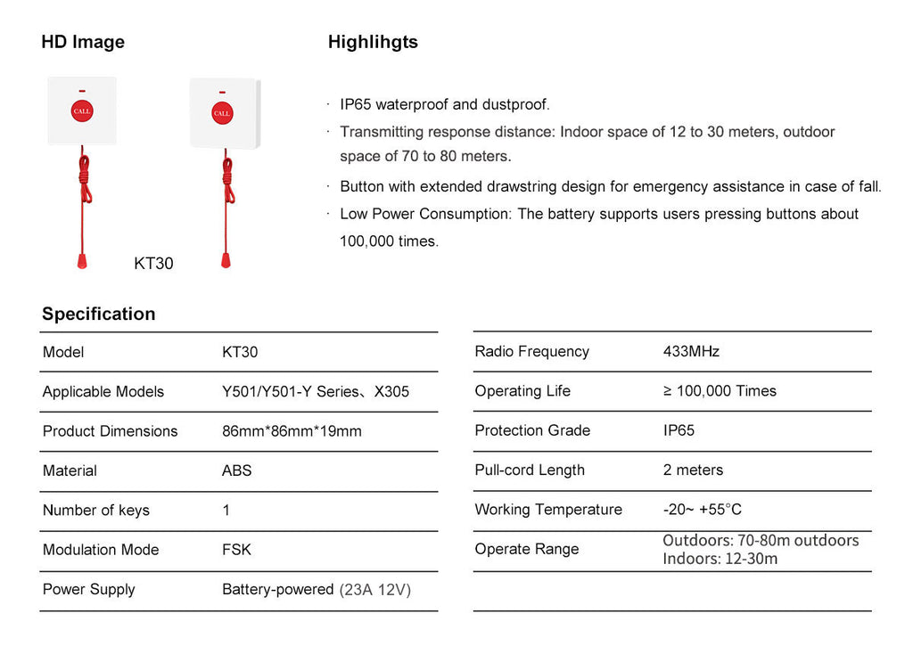 Fanvil KT30 is a wireless emergency button designed for wall installation, primarily intended for use in places such as bathrooms. It utilizes advanced 433MHz wireless frequency technology to ensure reliable signal transmission, providing users with immediate assistance in emergency situations.