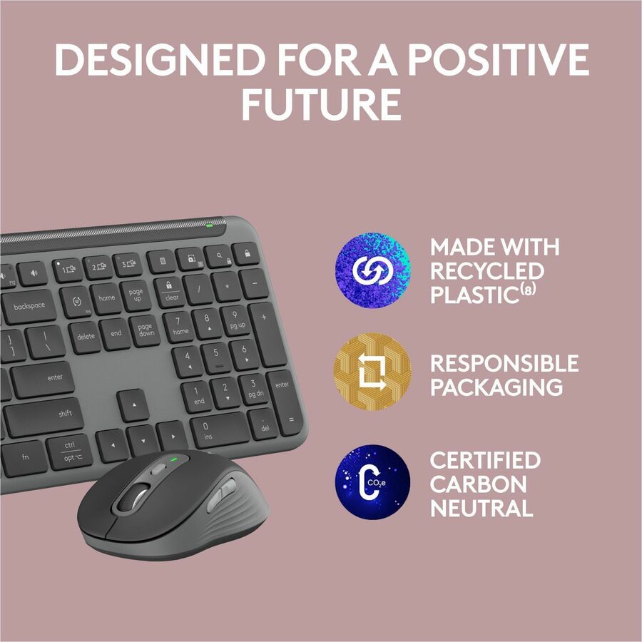 Type and click across computers effortlessly with the SIGNATURE SLIM Keyboard and Mouse MK955 made out of recycled plastic. Make work life magic with customization and shortcuts that keep you in control. Enjoy fast, precise scrolling and a familiar laptop-style keyboard feel that allows you to work even smarter with Logi Options+ App's custom shortcuts. Quiet typing and clicking gives you more focus, and less disturbance to others. Connect wirelessly with Bluetooth® or the included Logi Bolt USB receiver, and stay concentrated for longer with up to 36 months battery life for the keyboard and 24-months for the mouse.