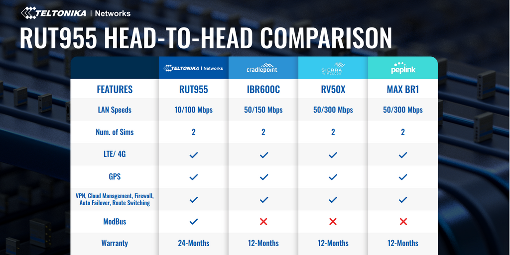 - RUT955 is a highly reliable industrial LTE Cat 4 router that delivers high performance and GNSS location capabilities.